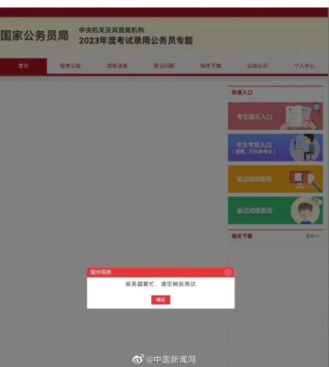 另據(jù)中新網(wǎng)報(bào)道,14日晚間,不少考生在網(wǎng)站曬出剛剛查到的2023國考筆試成績(jī)。一些網(wǎng)友反映2023國考專題網(wǎng)頁上分?jǐn)?shù)查詢通道擁擠,網(wǎng)頁顯示“服務(wù)器繁忙”。