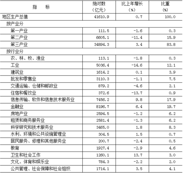 初步核算,全年實(shí)現(xiàn)地區(qū)生產(chǎn)總值41610.9億元,按不變價(jià)格計(jì)算,比上年增長0.7%。其中,第一產(chǎn)業(yè)[2]增加值111.5億元,下降1.6%;第二產(chǎn)業(yè)增加值6605.1億元,下降11.4%;第三產(chǎn)業(yè)增加值34894.3億元,增長3.4%。三次產(chǎn)業(yè)構(gòu)成為0.3︰15.9︰83.8。按常住人口計(jì)算,全市人均地區(qū)生產(chǎn)總值為19.0萬元。
