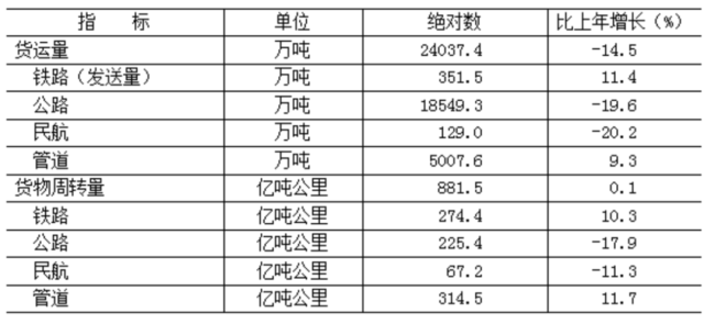 全年貨運(yùn)量24037.4萬噸,比上年下降14.5%;貨物周轉(zhuǎn)量881.5億噸公里,增長0.1%。全年客運(yùn)量28057.7萬人,下降33.7%;旅客周轉(zhuǎn)量580.5億人公里,下降44.6%。
