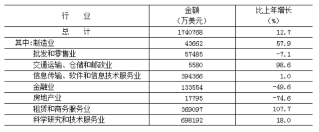 全年實(shí)際利用外商直接投資174.1億美元,按可比口徑[8]計(jì)算,比上年增長12.7%。其中,科學(xué)研究和技術(shù)服務(wù)業(yè)69.8億美元,占40.1%,增長18.0%;信息傳輸、軟件和信息技術(shù)服務(wù)業(yè)39.4億美元,占22.7%,增長1.0%;租賃和商務(wù)服務(wù)業(yè)36.9億美元,占21.2%,增長1.1倍。