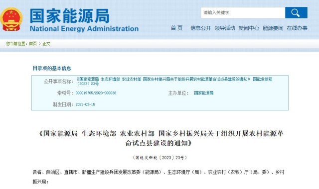 為深入貫徹落實黨中央、國務院決策部署,加大鄉(xiāng)村清潔能源建設力度,助力全面推進鄉(xiāng)村振興,國家能源局、生態(tài)環(huán)境部、農業(yè)農村部、國家鄉(xiāng)村振興局決定聯(lián)合組織開展農村能源革命試點縣建設。現(xiàn)將《農村能源革命試點縣建設方案》(以下簡稱《方案》,詳見附件1)印發(fā)你們,并就有關事項通知如下。