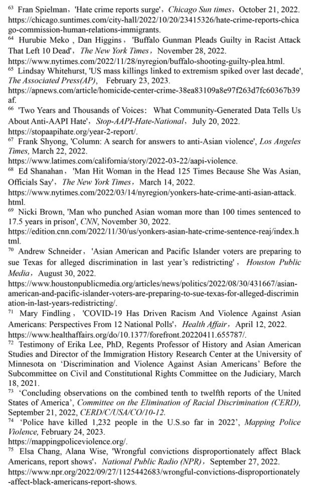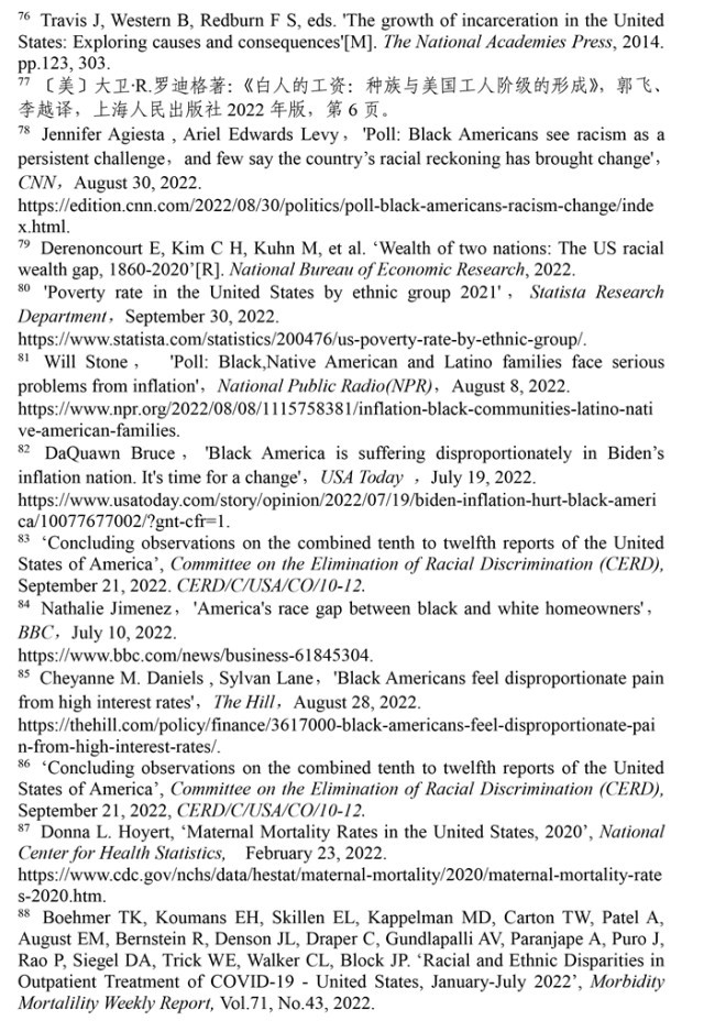 聯(lián)合國(guó)消除種族歧視委員會(huì)2022年9月21日發(fā)布的關(guān)于審議美國(guó)履行《消除一切形式種族歧視國(guó)際公約》情況的結(jié)論性報(bào)告指出,美國(guó)歷史上殖民主義和奴隸制留下的陰影至今仍揮之不去,助長(zhǎng)著美國(guó)社會(huì)流行的種族主義。近幾年來(lái),美國(guó)仇恨犯罪和仇恨言論事件顯著增加,與種族有關(guān)的槍支死傷人數(shù)大幅增加,有色人種和少數(shù)族裔在醫(yī)療、教育、住房等領(lǐng)域持續(xù)面臨系統(tǒng)性歧視。(注57)