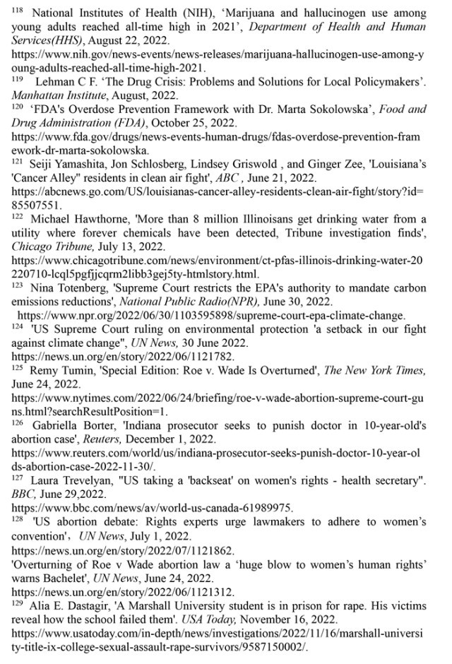 治理缺位危害環(huán)境權(quán)。美國(guó)廣播公司2022年6月21日?qǐng)?bào)道,在路易斯安那州,大量排放的工業(yè)廢料致使密西西比河沿岸出現(xiàn)諸多“癌癥巷”地區(qū),該地區(qū)民眾因空氣污染而患癌的風(fēng)險(xiǎn)較美國(guó)其他地區(qū)高出95%。(注121)《芝加哥論壇報(bào)》2022年7月13日?qǐng)?bào)道,在伊利諾伊州,占當(dāng)?shù)厝丝诩s60%的逾800萬(wàn)居民的飲用水中,檢測(cè)到至少含一種可能有損健康的“永久性化學(xué)物質(zhì)”。(注122)在環(huán)境形勢(shì)日趨惡化的背景下,美國(guó)聯(lián)邦最高法院卻于2022年6月裁定,美國(guó)環(huán)境保護(hù)局無(wú)權(quán)在未得到美國(guó)國(guó)會(huì)授權(quán)的條件下,在州層面限制溫室氣體排放量,也不得要求發(fā)電廠放棄化石燃料轉(zhuǎn)用可再生能源。(注123)聯(lián)合國(guó)秘書(shū)長(zhǎng)發(fā)言人杜加里克指出,美國(guó)聯(lián)邦最高法院的這一裁決,是“全球應(yīng)對(duì)氣候變化的一次挫折”。(注124)
