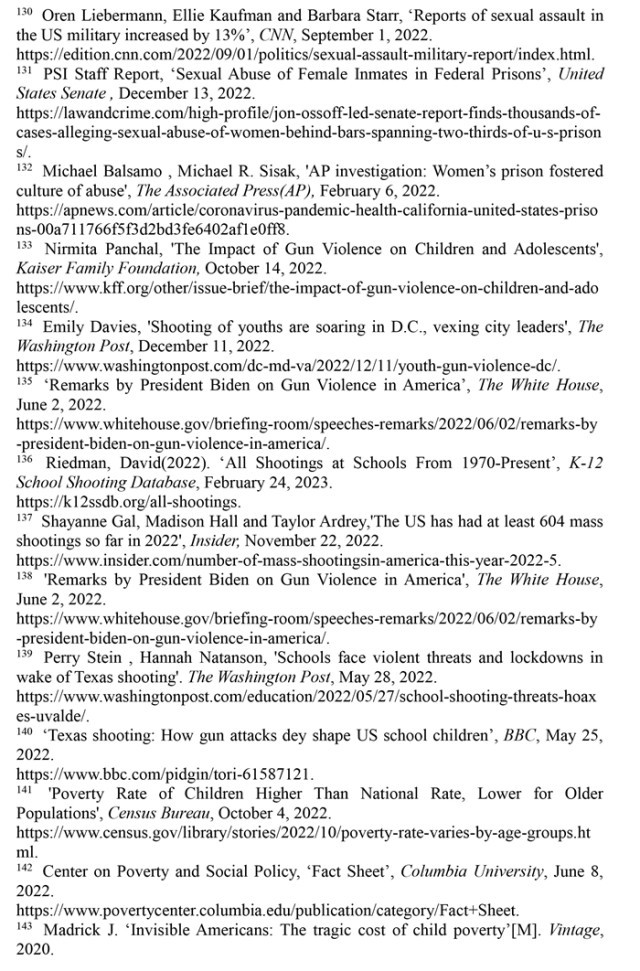 婦女墮胎失去憲法保護(hù),兒童生存環(huán)境令人擔(dān)憂。美國(guó)聯(lián)邦最高法院推翻“羅伊訴韋德案”的裁決終結(jié)了近50年來(lái)受憲法保護(hù)的墮胎權(quán),是對(duì)婦女人權(quán)和性別平等的巨大打擊。2022年美國(guó)有超過(guò)5800名18歲以下的兒童因槍擊受傷或死亡,校園槍擊事件數(shù)量高達(dá)302起,創(chuàng)1970年以來(lái)的最高值。美國(guó)兒童貧困率從2021年12月的12.1%上升至2022年5月的16.6%,增加了330萬(wàn)貧困兒童。2018年以來(lái)被非法雇用的童工激增近70%,2022財(cái)年受雇專門從事危險(xiǎn)工作的兒童增加了26%。