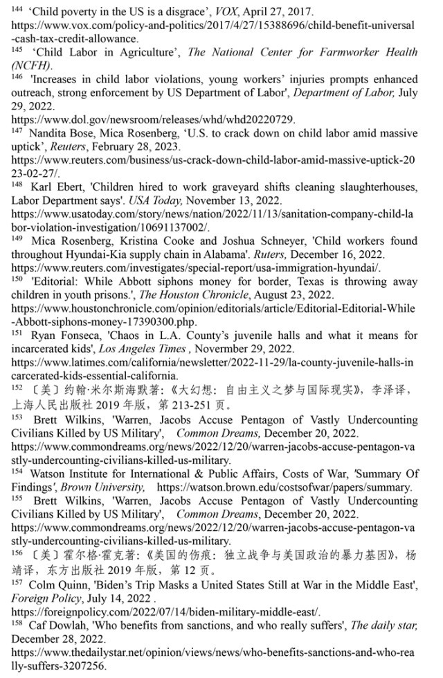 非法使用童工現(xiàn)象屢禁不止。根據(jù)非盈利組織“美國(guó)農(nóng)場(chǎng)工人健康中心”的數(shù)據(jù),美國(guó)有30萬(wàn)至80萬(wàn)名未成年人在農(nóng)場(chǎng)工作。(注145)美國(guó)《石板》網(wǎng)絡(luò)雜志指出,美國(guó)很多快餐店違反保護(hù)兒童健康與教育的規(guī)定,雇用青少年超時(shí)工作。童工問(wèn)題屢禁不止,根源是美國(guó)法律體系存在漏洞。受新冠疫情和供應(yīng)鏈危機(jī)影響,美國(guó)多地出現(xiàn)“用工荒”現(xiàn)象,多州批準(zhǔn)新法案延長(zhǎng)未成年人工作時(shí)間。根據(jù)美國(guó)勞工部的數(shù)據(jù),2022年,美國(guó)有數(shù)百萬(wàn)青少年受雇在農(nóng)業(yè)、食品服務(wù)、零售、娛樂(lè)和建筑行業(yè)工作。(注146)路透社2023年2月28日?qǐng)?bào)道,美國(guó)非法雇傭童工問(wèn)題日益嚴(yán)重,自2018年以來(lái),被非法雇用的童工激增了近70%。根據(jù)美國(guó)勞工部的數(shù)據(jù),2022財(cái)年有835家企業(yè)違法雇用3800名兒童,受雇專門從事危險(xiǎn)工作的兒童增加了26%。(注147)《今日美國(guó)報(bào)》2022年11月13日?qǐng)?bào)道,威斯康星州帕克斯清潔服務(wù)公司雇用了30多名13至17歲的未成年人在肉類加工廠和農(nóng)場(chǎng)擔(dān)任清潔工。幾名未成年雇員在工作中受傷,其中一名13歲兒童被腐蝕性清潔化學(xué)品燒傷。(注148)路透社2022年12月16日?qǐng)?bào)道,在阿拉巴馬州至少有四家汽車零部件供應(yīng)商被發(fā)現(xiàn)雇傭童工,勞務(wù)派遣機(jī)構(gòu)將未成年人移民安置在工廠工作。(注149)時(shí)至今日,美國(guó)仍是聯(lián)合國(guó)193個(gè)會(huì)員國(guó)中唯一沒(méi)有批準(zhǔn)《兒童權(quán)利公約》的國(guó)家,解決雇傭童工問(wèn)題的前景依然黯淡。