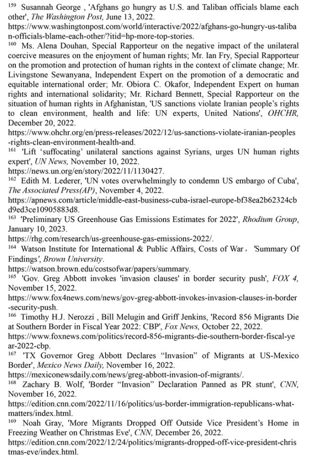 長(zhǎng)期肆意實(shí)施單邊制裁。近年來(lái),美國(guó)對(duì)其他國(guó)家實(shí)施的單邊制裁呈指數(shù)級(jí)增長(zhǎng),極大削弱了被制裁國(guó)家人權(quán)保障的能力與水平。孟加拉國(guó)《每日星報(bào)》2022年12月28日?qǐng)?bào)道,美國(guó)實(shí)施的單邊制裁總數(shù)為世界之最,目前仍在對(duì)20多個(gè)國(guó)家實(shí)施制裁,包括1962年以來(lái)對(duì)古巴的制裁、1979年以來(lái)對(duì)伊朗的制裁、2011年以來(lái)對(duì)敘利亞的制裁,以及近年來(lái)對(duì)阿富汗的制裁,導(dǎo)致被制裁國(guó)家無(wú)法向其人民提供基本的食物和藥品。(注158)《華盛頓郵報(bào)》2022年6月13日?qǐng)?bào)道,近一半的阿富汗人沒(méi)有足夠的食物,兒童營(yíng)養(yǎng)不良呈上升趨勢(shì)。(注159)2022年12月20日,多名聯(lián)合國(guó)人權(quán)理事會(huì)獨(dú)立專家發(fā)表共同聲明指出,美國(guó)政府對(duì)伊朗的制裁加劇了伊朗的環(huán)境危害,使所有在伊朗的民眾無(wú)法充分享受健康權(quán)和生命權(quán),侵犯了伊朗人民享有清潔環(huán)境的權(quán)利。(注160)聯(lián)合國(guó)單邊強(qiáng)制措施對(duì)人權(quán)負(fù)面影響問(wèn)題特別報(bào)告員阿萊娜·杜晗2022年11月10日指出,單邊制裁加劇了敘利亞人民的苦難,是對(duì)人權(quán)的嚴(yán)重侵犯。(注161)美國(guó)政府肆意實(shí)施制裁引發(fā)他國(guó)人權(quán)危機(jī)受到國(guó)際社會(huì)強(qiáng)烈譴責(zé)。2022年11月3日,聯(lián)合國(guó)大會(huì)就敦促美國(guó)終止對(duì)古巴的經(jīng)濟(jì)、商業(yè)和金融封鎖進(jìn)行投票表決。在193個(gè)成員國(guó)中,多達(dá)185個(gè)國(guó)家支持譴責(zé)美國(guó)對(duì)古巴的禁運(yùn)。(注162)這是聯(lián)合國(guó)大會(huì)連續(xù)30次通過(guò)類似決議。