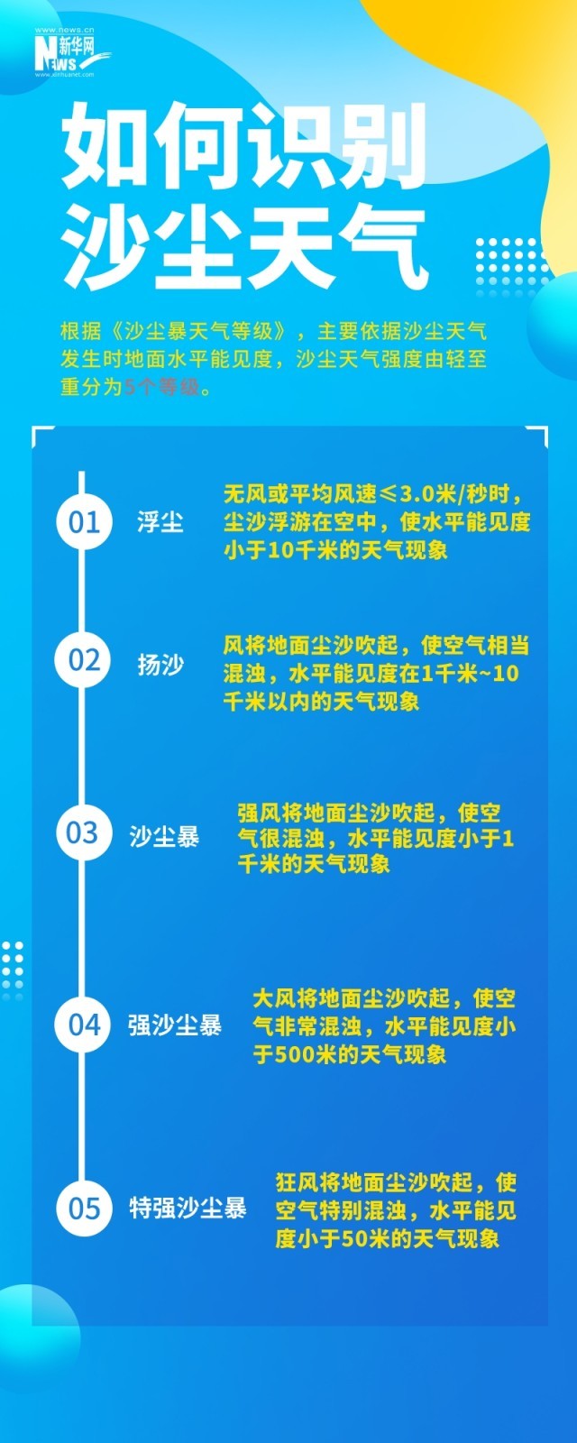 沙塵天氣是指風(fēng)將地面塵土、沙粒卷入空中,使空氣混濁的天氣現(xiàn)象。根據(jù)《沙塵暴天氣等級》,主要依據(jù)沙塵天氣發(fā)生時地面水平能見度,沙塵天氣強度由輕至重分為5個等級。
