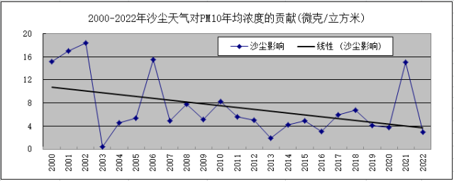 2000-2022年沙塵天氣對(duì)PM10年均濃度貢獻(xiàn)變化圖。圖片來(lái)源:北京市生態(tài)環(huán)境監(jiān)測(cè)中心