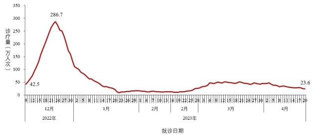 ?。ㄈ┏鞘邪l(fā)熱門(mén)診就診人數(shù)結(jié)果。全國(guó)二級(jí)以上醫(yī)療機(jī)構(gòu)和城市社區(qū)衛(wèi)生服務(wù)中心發(fā)熱門(mén)診(診室)就診人數(shù)于2022年12月22日達(dá)到峰值195.4萬(wàn)人次,隨后連續(xù)下降;1月23日后呈低位波動(dòng),約6周(2月24日-4月6日)的波動(dòng)增加及平臺(tái)波動(dòng)后,近2周(4月7日-4月20日)呈下降趨勢(shì),4月20日為16.8萬(wàn)人次,較峰值下降了91.4%(圖2-3)。