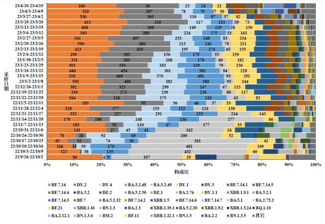 2.圖中標(biāo)記的數(shù)字按順序分別為BF.7.14、DY.2、DY.4、BA.5.2.48、BA.5.2.49和DY.1進(jìn)化分支有效基因組序列數(shù)量;