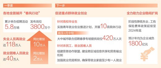 保重點,促進重點群體就業(yè)創(chuàng)業(yè)。針對高校畢業(yè)生,將實施促進高校畢業(yè)生等青年就業(yè)創(chuàng)業(yè)推進計劃,開展10項具體行動,著力拓展就業(yè)渠道、做實做細就業(yè)服務、強化困難兜底保障。截至4月中旬,大中城市聯(lián)合招聘春季專場提供崗位420萬人次。針對農民工、就業(yè)困難人員,將組建勞務協(xié)作聯(lián)盟,健全跨區(qū)域信息共享和勞務輸出機制。加強困難群體就業(yè)兜底幫扶,確保零就業(yè)家庭至少有一人就業(yè)。