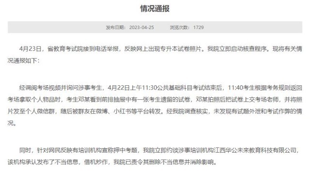 經(jīng)調(diào)閱考場(chǎng)視頻并詢問涉事考生,4月22日上午11:30公共基礎(chǔ)科目考試結(jié)束后,11:40考生根據(jù)考務(wù)規(guī)則返回考場(chǎng)拿取個(gè)人物品時(shí),考生鄧某看到前排抽屜中有一張考生遺留的試卷,鄧某拍照后把試卷上交考場(chǎng)老師,并將照片發(fā)至個(gè)人微信群,隨后被群友在微博、小紅書等平臺(tái)轉(zhuǎn)發(fā)。經(jīng)江西省教育考試院調(diào)查核實(shí),未發(fā)現(xiàn)有試題外泄和考試作弊的情況。