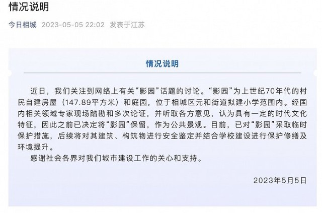 央視網(wǎng)消息:蘇州相城區(qū)委宣傳部公眾號(hào)“今日相城”5月5日發(fā)布情況說(shuō)明稱,近日關(guān)注到網(wǎng)絡(luò)上有關(guān)“影園”話題的討論。“影園”為上世紀(jì)70年代的村民自建房屋(147.89平方米)和庭園,位于相城區(qū)元和街道擬建小學(xué)范圍內(nèi)。經(jīng)國(guó)內(nèi)相關(guān)領(lǐng)域?qū)<椰F(xiàn)場(chǎng)踏勘和多次論證,并聽(tīng)取各方意見(jiàn),認(rèn)為具有一定的時(shí)代文化特征,因此之前已決定將“影園”保留,作為公共景觀。目前,已對(duì)“影園”采取臨時(shí)保護(hù)措施,后續(xù)將對(duì)其建筑、構(gòu)筑物進(jìn)行安全鑒定并結(jié)合學(xué)校建設(shè)進(jìn)行保護(hù)修繕及環(huán)境提升。