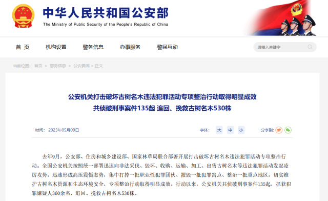 公安機(jī)關(guān)打擊破壞古樹名木違法犯罪活動專項整治行動取得明顯成效 追回、挽救古樹名木530株