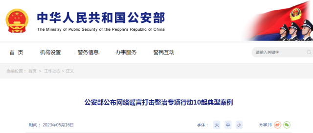 公安部今日公布打擊整治網(wǎng)絡(luò)謠言10起典型案例: