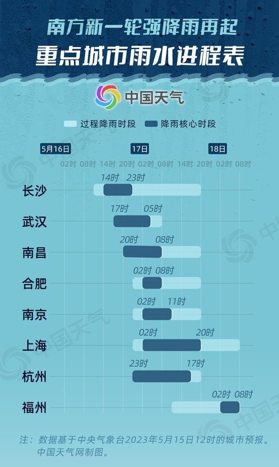 從中國天氣網推出的重點城市雨水進程表可以看出,長沙、武漢的降雨從明天白天就會陸續(xù)展開,降雨核心時段出現在明天下午到晚上。南昌、合肥、南京、上海和杭州的降雨都會在明天晚上開始,其中南昌的降雨核心時段集中在明天晚上,合肥、南京、上海和杭州集中在后天白天。福州由于處在最東邊,因此降雨核心時段最晚,主要集中在18日上午。