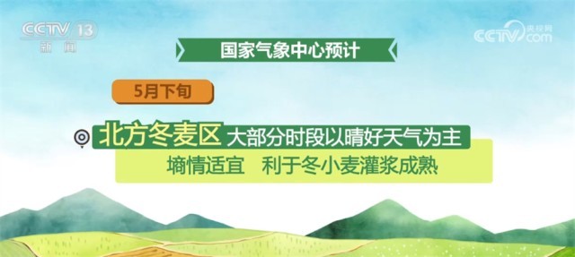 國家氣象中心預計,5月下旬,北方冬麥區(qū)大部分時段以晴好天氣為主,墑情適宜,利于冬小麥灌漿成熟;江漢、江南及四川盆地、貴州等地有較強降雨,夏收作業(yè)將短暫受阻;江淮大部天氣較好,適宜夏收。