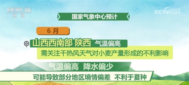 6月,西北、華北和黃淮冬麥區(qū)大部氣溫接近常年同期或偏高,大部地區(qū)降水接近常年或偏少,氣象條件總體利于冬小麥收獲晾曬;但山西西南部、陜西氣溫偏高,需關注干熱風天氣對小麥產(chǎn)量形成的不利影響,此外,氣溫偏高、降水偏少可能導致部分地區(qū)墑情偏差,不利于夏種。