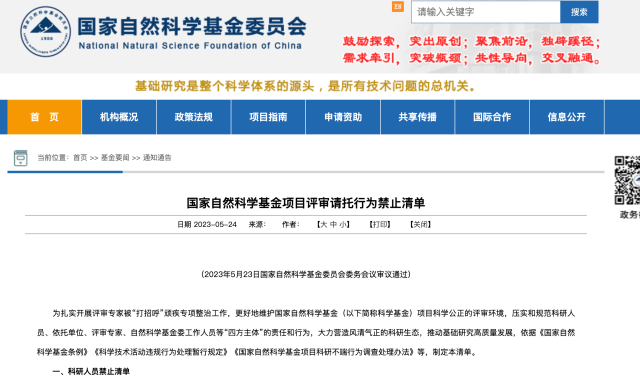 國家自然科學基金項目評審請托行為禁止清單