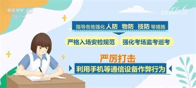 同時,會同公安部、工業(yè)和信息化部等部門聯(lián)合開展打擊作弊專項行動,將防范手機(jī)作弊作為重中之重,多措并舉、綜合施策,指導(dǎo)各地強(qiáng)化人防、物防、技防等措施,嚴(yán)格入場安檢規(guī)范,強(qiáng)化考場監(jiān)考巡考,嚴(yán)厲打擊利用手機(jī)等通信設(shè)備作弊行為。對于在高考中存在作弊行為的考生和人員,將依法依規(guī)嚴(yán)肅處理,堅決維護(hù)高考的公平公正。