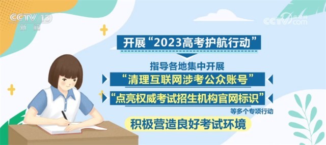 此外,將繼續(xù)開展“2023高考護(hù)航行動”,指導(dǎo)各地集中開展“清理互聯(lián)網(wǎng)涉考公眾賬號”“點亮權(quán)威考試招生機(jī)構(gòu)官網(wǎng)標(biāo)識”等多個專項行動,積極營造良好考試環(huán)境。