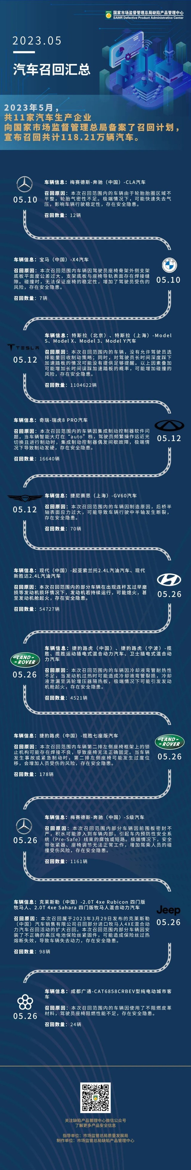 據(jù)“市說新語”微信公眾號6月7日消息,2023年5月共11家汽車生產(chǎn)企業(yè)向市場監(jiān)管總局備案了召回計劃,宣布號回共計118.21萬輛汽車。