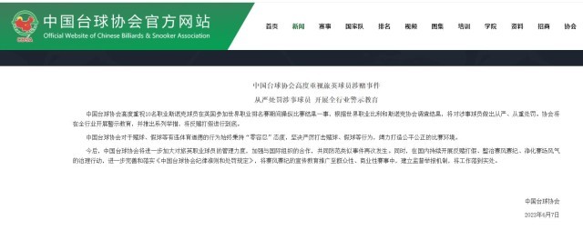 中國(guó)臺(tái)球協(xié)會(huì):將從嚴(yán)處罰旅英涉賭球員 開展全行業(yè)警示教育
