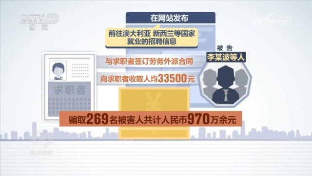 2023年5月,北京市房山區(qū)法院也判決了一起出國勞務(wù)詐騙案,被告李某波因詐騙罪一審判決13年6個月有期徒刑。判決書顯示:被告李某波等人冒用北京一家勞務(wù)派遣有限公司名義開展業(yè)務(wù),在網(wǎng)站發(fā)布前往澳大利亞、新西蘭等國家就業(yè)的招聘信息,與求職者簽訂勞務(wù)外派合同,向求職者收取人均33500元的費(fèi)用,最終騙取269名被害人共計(jì)人民幣970萬余元。檢察官還總結(jié)了這類詐騙案的幾個特點(diǎn)。