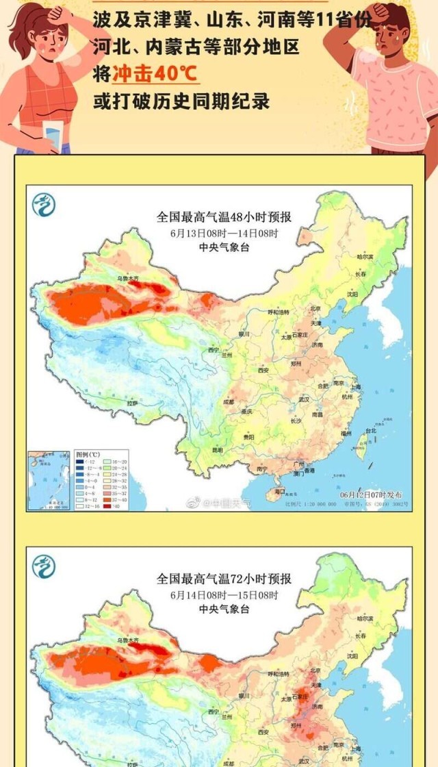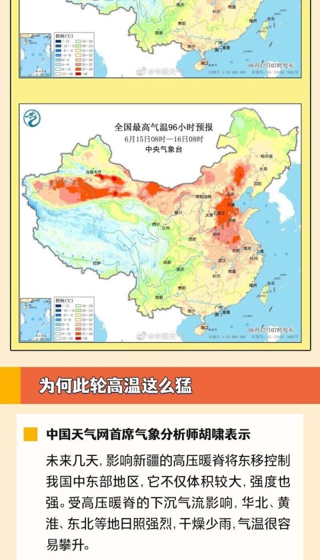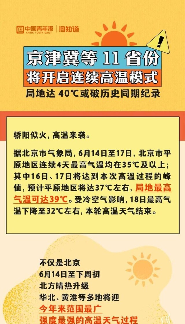 6月14日至下周初,華北、黃淮等多地將迎今年來范圍最廣、強(qiáng)度最強(qiáng)的高溫天氣過程,波及京津冀、山東、河南等11省份,河北、內(nèi)蒙古等部分地區(qū)將沖擊40℃,或打破歷史同期紀(jì)錄。全國總工會(huì)也發(fā)出提示,各級(jí)工會(huì)要督促用人單位提供必要的防護(hù)用品和高溫作業(yè)休息場(chǎng)所。為何這輪高溫這么猛?有哪些防范高溫天氣的建議?一起來看。