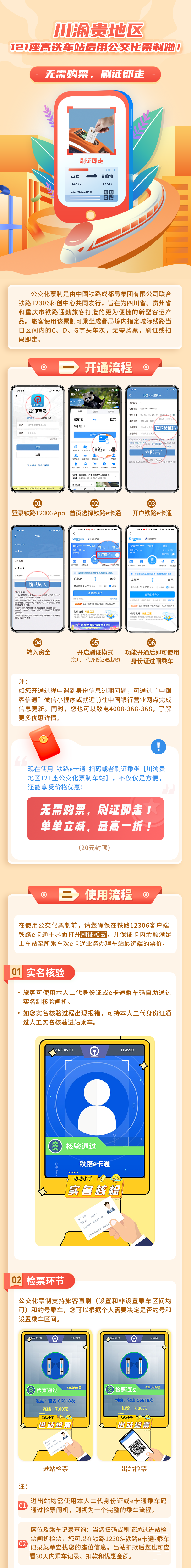 為進(jìn)一步提升通勤旅客出行體驗(yàn),中國(guó)鐵路成都局集團(tuán)有限公司管內(nèi)的川渝貴地區(qū)121座高鐵車站啟用公交化票制。已開通鐵路e卡通的旅客在鐵路12306客戶端-鐵路e卡通主頁(yè),啟用刷證模式,即可使用二代身份證或e卡通乘車碼,實(shí)現(xiàn)無(wú)需購(gòu)票,刷證或掃碼即走。