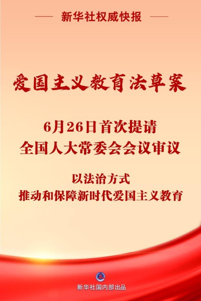 愛國(guó)主義教育法草案6月26日首次提請(qǐng)全國(guó)人大常委會(huì)會(huì)議審議。制定愛國(guó)主義教育法,以法治方式推動(dòng)和保障新時(shí)代愛國(guó)主義教育,對(duì)于振奮民族精神、凝聚人民力量,推進(jìn)強(qiáng)國(guó)建設(shè)、民族復(fù)興,具有十分重大而深遠(yuǎn)的意義。