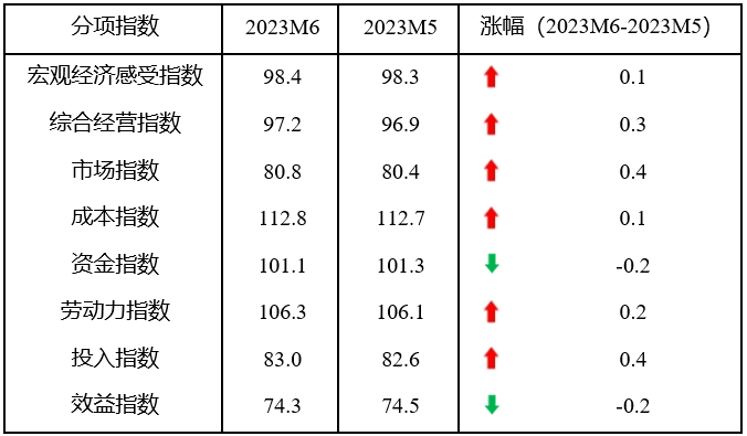 從分項(xiàng)指數(shù)看,6月份,8個(gè)分項(xiàng)指數(shù)6升2降,宏觀經(jīng)濟(jì)感受指數(shù)、市場(chǎng)指數(shù)、成本指數(shù)和投入指數(shù)止跌回升,綜合經(jīng)營指數(shù)由平轉(zhuǎn)升,勞動(dòng)力指數(shù)連續(xù)兩個(gè)月上升,資金指數(shù)和效益指數(shù)由升或平轉(zhuǎn)降。