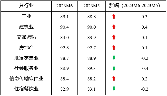 具體來看,6月份,8個(gè)分行業(yè)指數(shù)5升3降,工業(yè)、建筑業(yè)、交通運(yùn)輸郵政倉儲(chǔ)業(yè)、房地產(chǎn)業(yè)和信息傳輸計(jì)算機(jī)服務(wù)軟件業(yè)指數(shù)分別上升0.3、0.4、0.1、0.1和0.2點(diǎn),而批發(fā)零售業(yè)、社會(huì)服務(wù)業(yè)和住宿餐飲業(yè)指數(shù)分別下降0.2、0.4和0.2點(diǎn)。由此可見,工業(yè)和建筑業(yè)指數(shù)開始回升;而服務(wù)業(yè)指數(shù)的上漲勢(shì)頭出現(xiàn)回調(diào)。