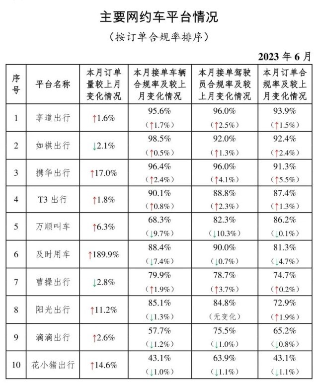 其中,面向乘客、與網(wǎng)約車平臺公司共同提供服務(wù)的平臺(俗稱“聚合平臺”)完成2.18億單,環(huán)比上升4.0%。按訂單合規(guī)率由高到低的分別是滴滴出行、高德打車、花小豬出行、美團(tuán)打車、百度打車、騰訊出行、攜程用車。