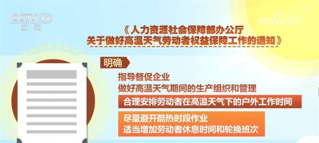 《通知》明確,指導督促企業(yè)做好高溫天氣期間的生產(chǎn)組織和管理,合理安排勞動者在高溫天氣下的戶外工作時間,盡量避開酷熱時段作業(yè),適當增加勞動者休息時間和輪換班次。