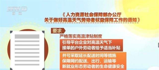 央視網(wǎng)消息:近日,人力資源和社會保障部就做好高溫天氣勞動者權(quán)益保障工作印發(fā)《通知》。其中,對快遞、外賣人員等靈活就業(yè)人員的高溫天氣下如何保障做出了專門的要求。