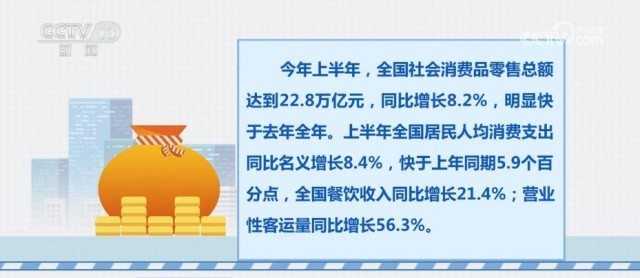 今年上半年,全國(guó)社會(huì)消費(fèi)品零售總額達(dá)到22.8萬億元,同比增長(zhǎng)8.2%,明顯快于去年全年。上半年全國(guó)居民人均消費(fèi)支出同比名義增長(zhǎng)8.4%,快于上年同期5.9個(gè)百分點(diǎn),全國(guó)餐飲收入同比增長(zhǎng)21.4%;營(yíng)業(yè)性客運(yùn)量同比增長(zhǎng)56.3%。