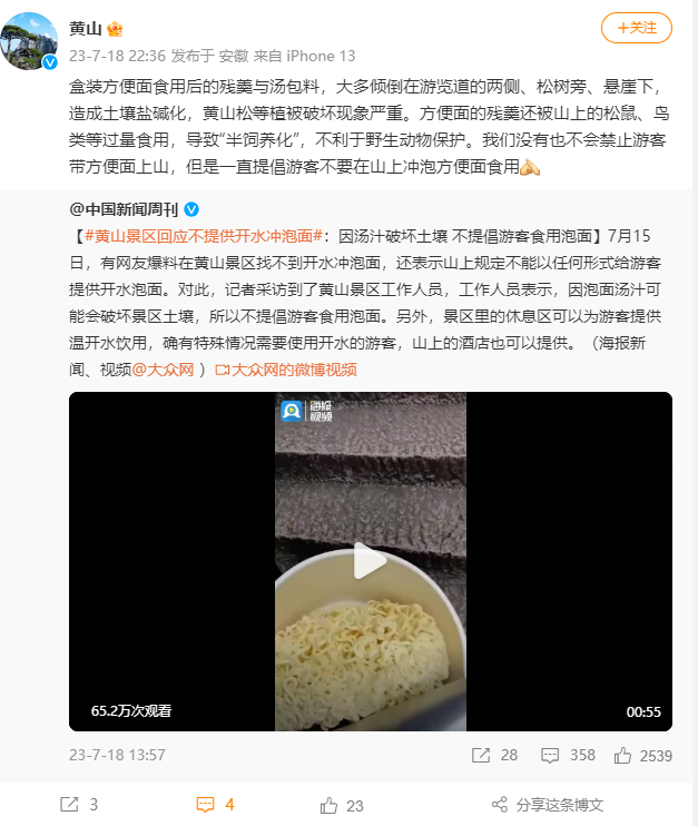 央視網(wǎng)消息:據(jù)@黃山 微博消息,7月18日晚,黃山風(fēng)景區(qū)官方微博發(fā)文回應(yīng)不提供開水沖泡面:盒裝方便面食用后的殘羹與湯包料,大多傾倒在游覽道的兩側(cè)、松樹旁、懸崖下,造成土壤鹽堿化,黃山松等植被破壞現(xiàn)象嚴重。方便面的殘羹還被山上的松鼠、鳥類等過量食用,導(dǎo)致“半飼養(yǎng)化”,不利于野生動物保護。我們沒有也不會禁止游客帶方便面上山,但是一直提倡游客不要在山上沖泡方便面食用。