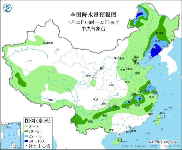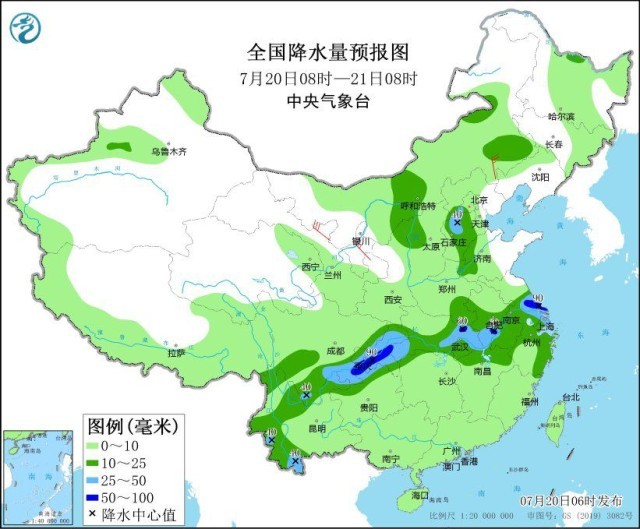 圖1 全國降水量預(yù)報(bào)圖(7月20日08時(shí)-21日08時(shí))