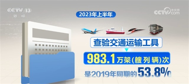 據(jù)國(guó)家移民管理局統(tǒng)計(jì),2023年上半年,全國(guó)移民管理機(jī)構(gòu)共查驗(yàn)出入境人員1.68億人次,是2019年同期的48.8%,其中內(nèi)地居民8027.6萬(wàn)人次,港澳臺(tái)居民7490.3萬(wàn)人次,外國(guó)人843.8萬(wàn)人次(不含邊民);查驗(yàn)交通運(yùn)輸工具983.1萬(wàn)架(艘、列、輛)次,是2019年同期的53.8%,其中,飛機(jī)20.4萬(wàn)架次、船舶19.1萬(wàn)艘次、火車4.4萬(wàn)列次、汽車939.2萬(wàn)輛次。
