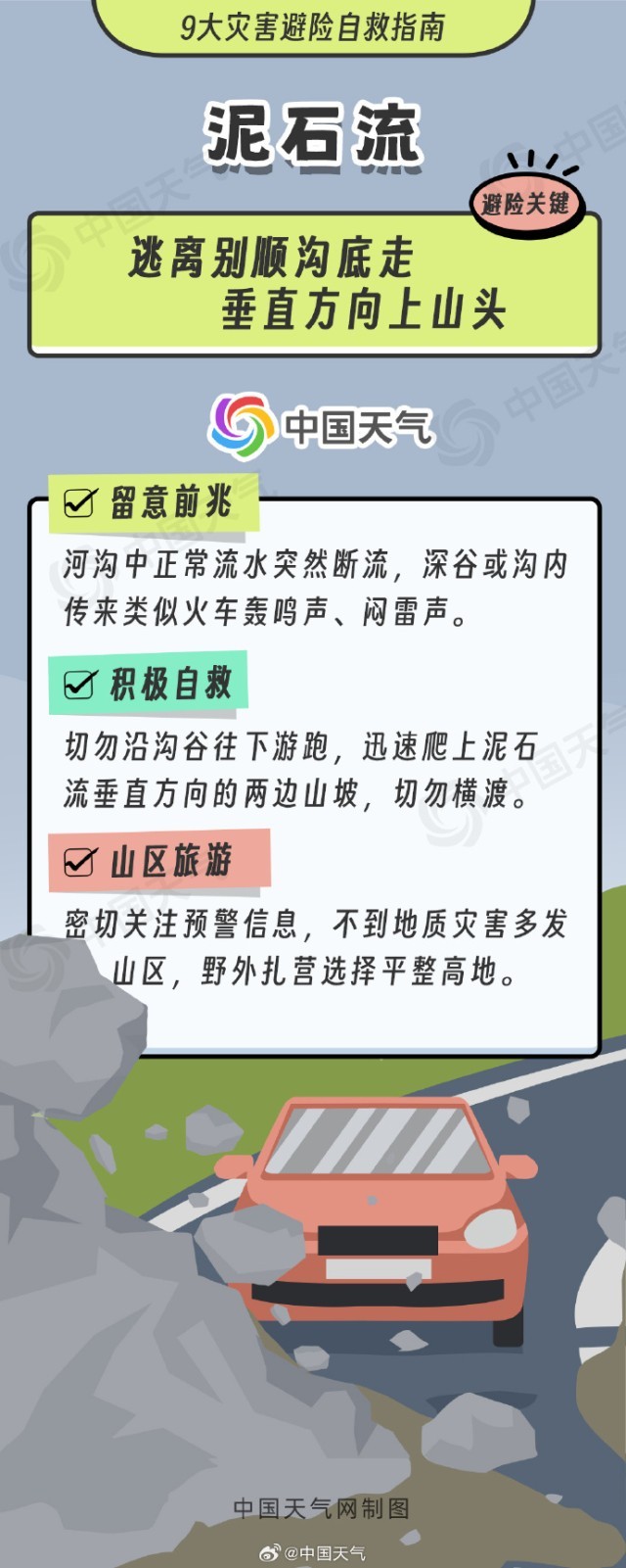 雨后山區(qū)道路沿線易發(fā)生落石,大家請避免在陡峭石壁或凸石下停留,當(dāng)災(zāi)害發(fā)生時要迅速向崩塌體兩側(cè)逃生;房前屋后土體突然鼓脹,局部出現(xiàn)滑塌或裂縫,并有水流滲出時,要警惕滑坡災(zāi)害,快速向滑動方向兩側(cè)逃離;地面出現(xiàn)環(huán)狀裂縫,地形下凹或地表水快速滲漏,建筑物出現(xiàn)傾斜開裂時,要迅速遠(yuǎn)離沉陷地帶。