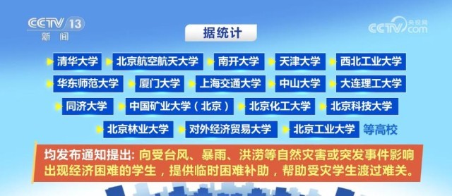 據(jù)統(tǒng)計(jì),清華大學(xué)、北京航空航天大學(xué)、南開大學(xué)、天津大學(xué)、西北工業(yè)大學(xué)、華東師范大學(xué)、廈門大學(xué)、上海交通大學(xué)、中山大學(xué)、大連理工大學(xué)、同濟(jì)大學(xué)、中國礦業(yè)大學(xué)(北京)、北京化工大學(xué)、北京科技大學(xué)、北京林業(yè)大學(xué)、對外經(jīng)濟(jì)貿(mào)易大學(xué)、北京工業(yè)大學(xué)等高校均發(fā)布通知提出,向受臺(tái)風(fēng)、暴雨、洪澇等自然災(zāi)害或突發(fā)事件影響出現(xiàn)經(jīng)濟(jì)困難的學(xué)生,提供臨時(shí)困難補(bǔ)助,幫助受災(zāi)學(xué)生渡過難關(guān)。