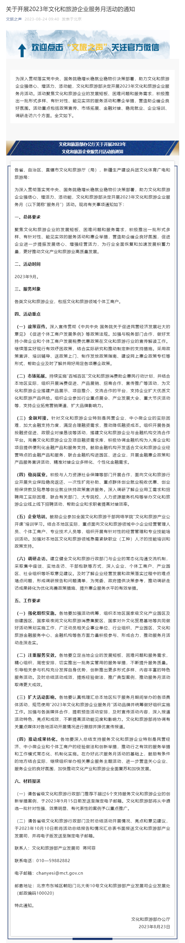 文旅部:將于9月開(kāi)展2023年文化和旅游企業(yè)服務(wù)月活動(dòng)
