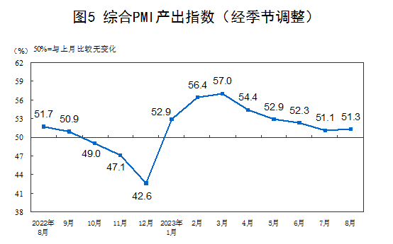 8月份,綜合PMI產(chǎn)出指數(shù)為51.3%,比上月上升0.2個百分點(diǎn),繼續(xù)保持在擴(kuò)張區(qū)間,表明我國企業(yè)生產(chǎn)經(jīng)營活動總體穩(wěn)定擴(kuò)張。