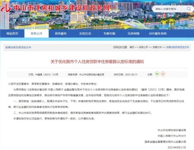 中新網(wǎng)8月31日電 據(jù)廣東省中山市住房和城鄉(xiāng)建設(shè)局網(wǎng)站消息,31日,中山市住房和城鄉(xiāng)建設(shè)局、中國(guó)人民銀行中山市分行、國(guó)家金融監(jiān)督管理總局中山監(jiān)管分局等三部門(mén)聯(lián)合發(fā)布《關(guān)于優(yōu)化我市個(gè)人住房貸款中住房套數(shù)認(rèn)定標(biāo)準(zhǔn)的通知》。通知提出,居民家庭(包括借款人、配偶及未成年子女,下同)申請(qǐng)貸款購(gòu)買(mǎi)商品住房時(shí),家庭成員在當(dāng)?shù)孛聼o(wú)成套住房的,不論是否已利用貸款購(gòu)買(mǎi)過(guò)住房,銀行業(yè)金融機(jī)構(gòu)均按首套住房執(zhí)行住房信貸政策。