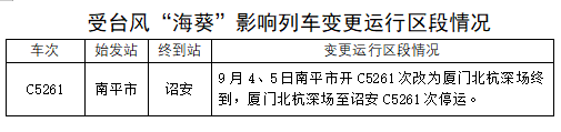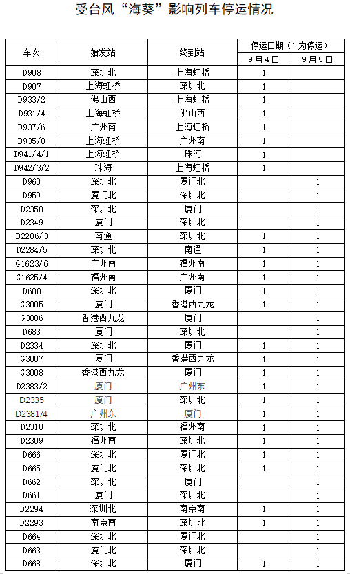 據(jù)中央氣象臺消息,今年第11號臺風“海葵”將于5日凌晨到上午在福建漳浦至廣東惠來一帶沿海登陸,福建東部部分地區(qū)可能有大到暴雨,福建東南部部分地區(qū)有大暴雨,局地特大暴雨。為防范臺風影響,保障運輸安全,中國鐵路南昌局集團有限公司調(diào)整部分旅客列車運行方案,停運途經(jīng)杭深線管內(nèi)漳州(不含)至詔安區(qū)段旅客列車。