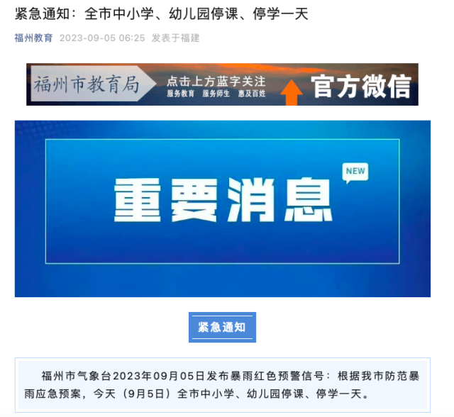 中國青年報客戶端福州9月5日電(中青報·中青網(wǎng)記者 田宏煒)今天早上6時,福州市教育局緊急通知,根據(jù)福州市防范暴雨應急預案,全市中小學、幼兒園停課、停學一天。