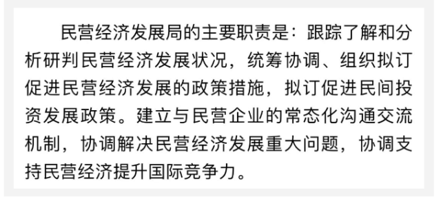 今天(9月4日)有個消息刷了屏:國家發(fā)改委新設(shè)民營經(jīng)濟發(fā)展局。仔細(xì)閱讀官方通稿,民營經(jīng)濟發(fā)展局主要職責(zé)103字,沒提一個“管”字。點擊視頻↓↓↓
