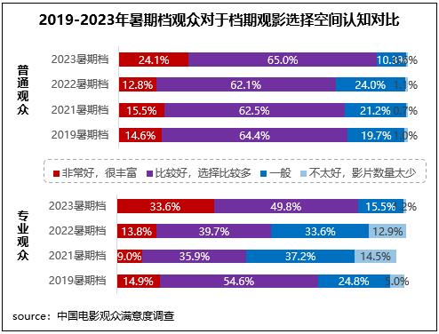 2023年7-8月新上映影片共80部,為近四年來同期最高值,滿意度調(diào)查的13部影片涵蓋劇情、動畫、奇幻、懸疑、愛情、喜劇、動作等多元類型,給觀眾帶來多樣化的觀影選擇。調(diào)研數(shù)據(jù)顯示,不同觀眾對于檔期觀影選擇空間均給予了好評,普通觀眾、專業(yè)觀眾認為檔期觀影選擇“非常好,很豐富”和“比較好,選擇比較多”的占比合計分別達89.2%、83.4%,均為近五年同期最高。