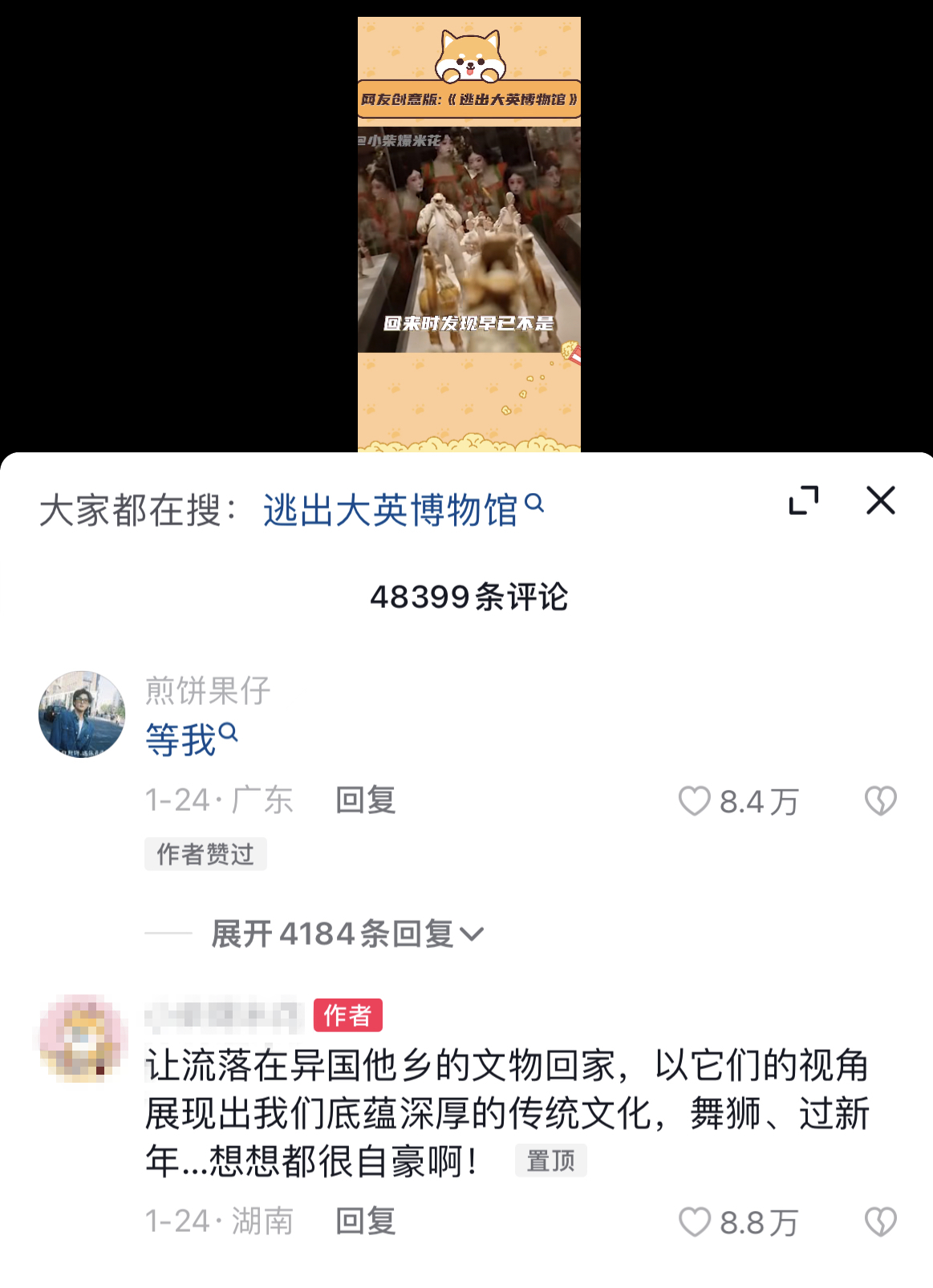 這仿佛巧合般的存在,實(shí)則藏著一條文化接力的暗線。2023年初,一名網(wǎng)友自制短視頻,提出了《逃出大英博物館》的創(chuàng)意想法:“讓流落在異國(guó)他鄉(xiāng)的文物回家,以它們的視角展現(xiàn)出我們底蘊(yùn)深厚的傳統(tǒng)文化?!彼⒌揭曨l的煎餅果仔在評(píng)論區(qū)留下了兩個(gè)字“等我”。